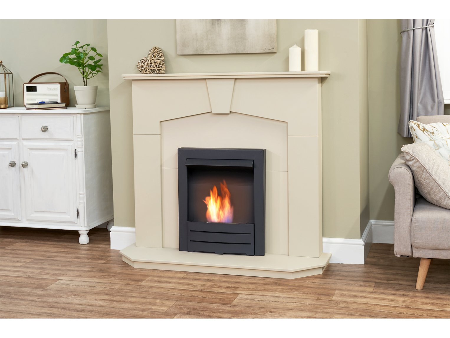 - Textured stone effect surround, back panel & hearth.- Black bio ethanol inset fire.