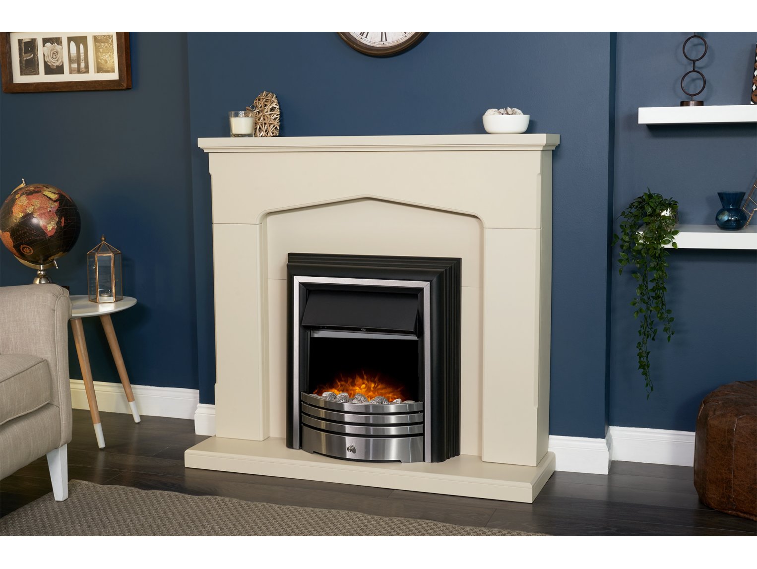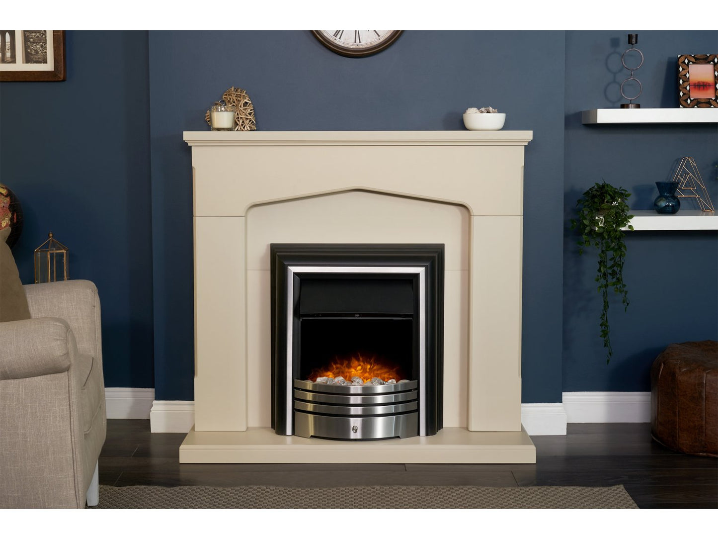 - Stone effect surround.- Brushed steel freestanding electric fire.