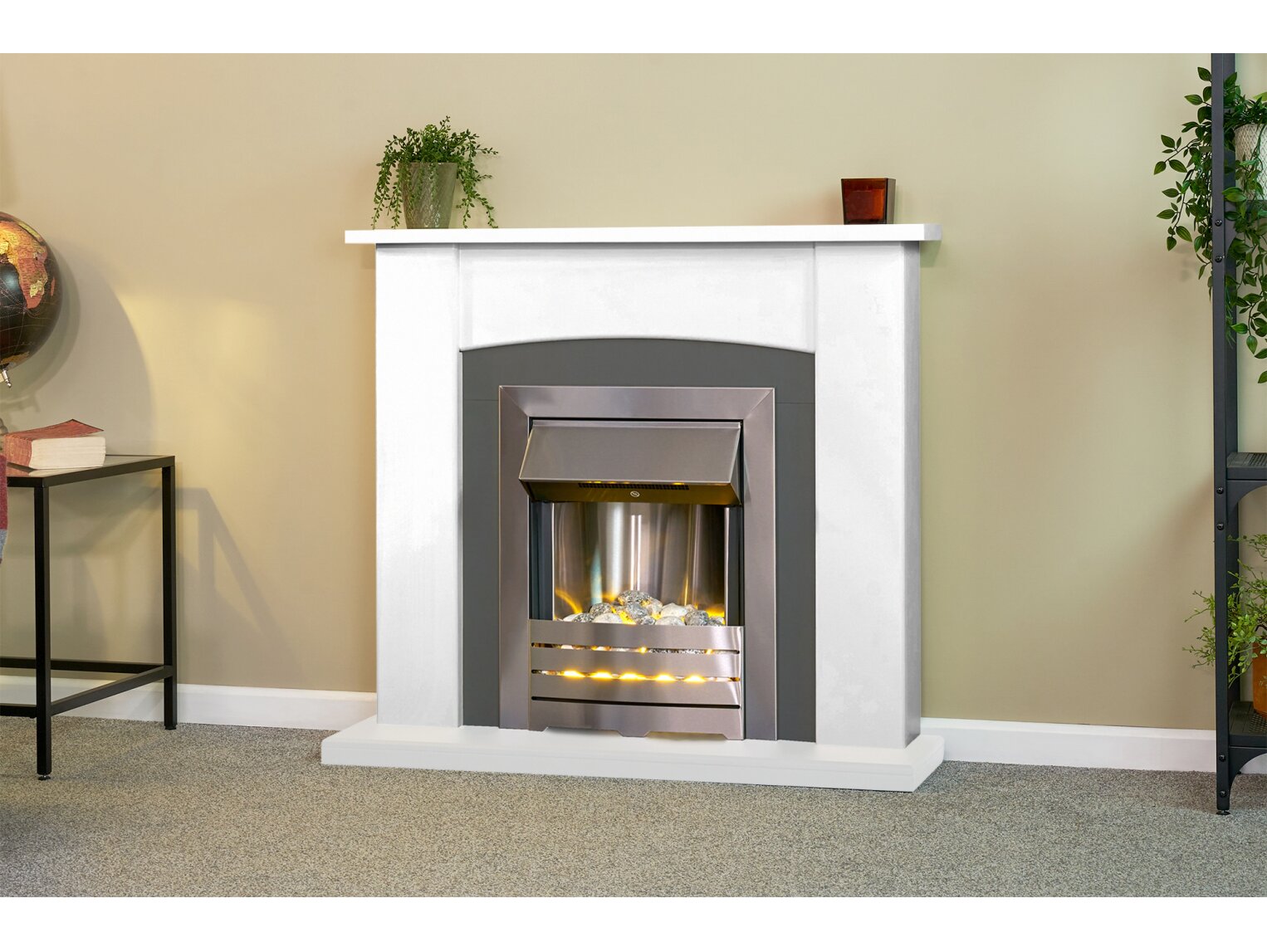 Adam Holden Fireplace in Pure White & Grey/White with Helios Electric Fire in Brushed Steel, 39 Inch