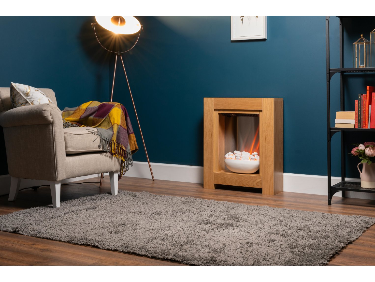 Our Adam Monet Fireplace Suite is eye-catching and stylish, the insert holds an electric fire that simmers gently in a bowl of white pebbles. The straight, oak lines of the surround have a decidedly minimalist allure, and combine with the pure white colour of the bowl and delicately glowing embers to lend your home an attractive, contemporary quality.Technical Specs: