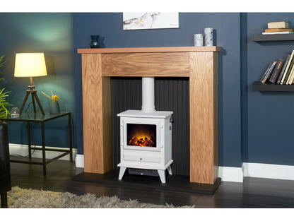 The Adam New England stove fireplace suite offers an attractive and modern focal point for your home with its oak effect surround and black back panel and hearth. But what really make this stove suite stand out is the combination of the brilliant Adam Hudson electric stove. The stove provides a heat output of 0.9kW - 1.8kW and also features an LED flame effect only option. The controls are located on the side of the stove along with the thermostat for ease of access, the stove is also complemented by the pure white straight stove pipe. We can guarantee that this Adam New England electric stove fireplace suite will make your house a home.