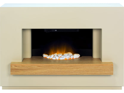 With its rectangular design and stone effect, the Adam Sambro is one of the most contemporary fireplaces in our catalogue. In its centre, a delicate nest of natural pebbles rest on top of an oak shelf, glowing gently to create a cosy ember-bed. The fireplace is free standing, and has also been designed to fit snugly beneath a wall mounted TV – perfect if there’s nothing on the box. Simply fit flat against a wall and start enjoying this bold and unique fireplace.Technical Specs: