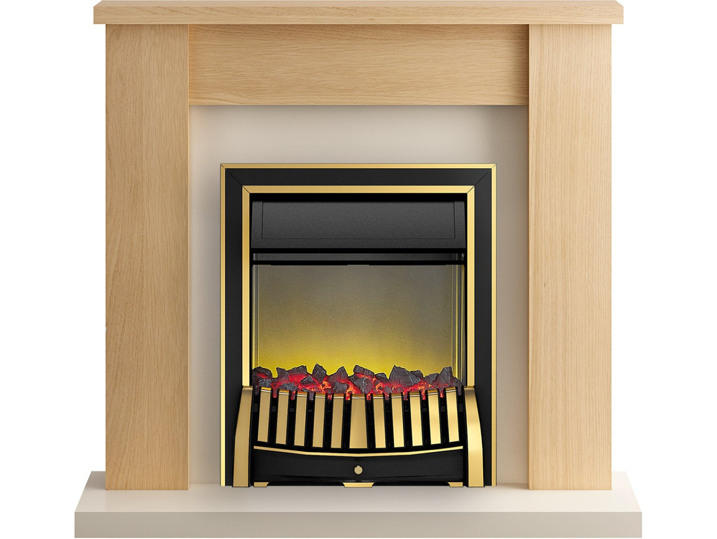 There’s a reason this fireplace suite is called the Solus. With its radiant colour and cheerful design, the Solus is your very own little piece of sunshine. The natural oak veneer surround positively beams with its bright tone and intricate grain, complementing the smooth hue of the satin ivory back panel and hearth. A brass Elan Electric Fire completes the ensemble, with a coal bed to give a natural flame effect.Technical Specs: